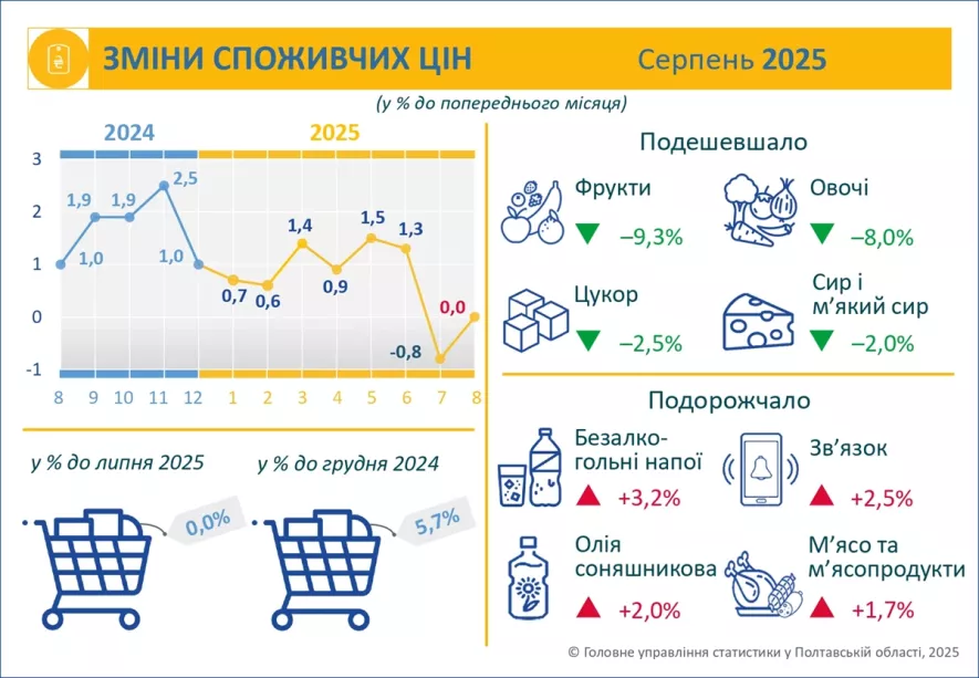 У серпні поточного року ціни на Полтавщині залишилися стабільними: що подорожчало, а що подешевшало. Згідно з даними обласного управління статистики, споживчий ринок Полтавщини у серпні не змінився в порівнянні з липнем. З початку року ціни зросли на 5,7%, у той час як в Україні загалом у серпні зафіксовано зниження на 0,2%, а з початку року спостерігається зростання на 6%.