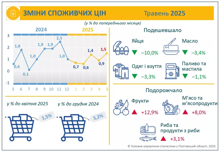 У травні на споживчому ринку Полтавщини було зафіксовано як зниження, так і підвищення цін на різні товари. Найбільше впали ціни на яйця — на 10,0%, на масло — на 3,4%, а також на одяг і взуття — на 3,3% і паливо з мастила — на 1,1%. Водночас, спостерігалося зростання цін на фрукти на 12,9%, на м’ясо та м’ясопродукти на 8,0%, а також на рибу та продукти з риби — на 3,1%.