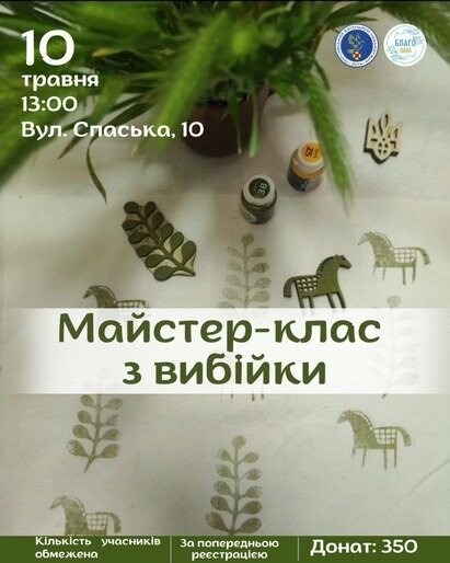 10 травня о 13:00 на адресі вул. Спаська, 10 пройде майстер-клас із вибійки — традиційного методу декорування тканини. Усі учасники матимуть змогу власноруч прикрасити серветки, настільні ранери або елементи одягу, пробуючи різноманітні візерунки та кольорові комбінації.