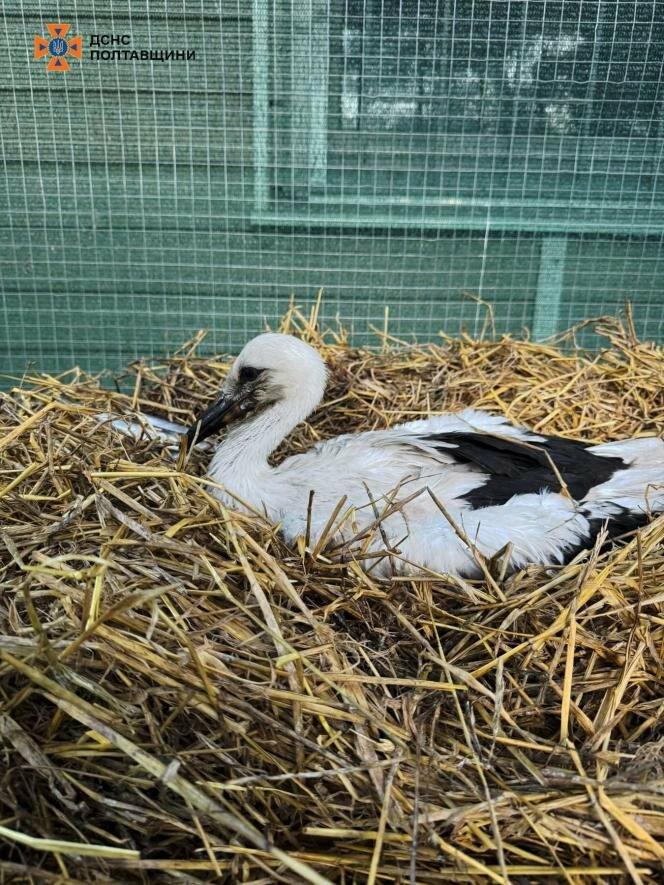 На Полтавщині рятувальники змогли врятувати самотнє лелеченя. До служби екстреної допомоги «101» надійшла інформація про те, що в селищі Нова Галещина на одному зі стовпів у гнізді залишилося без батьків пташеня. Його мати та батько відлетіли, а через велику висоту, на якій воно перебувало, місцеві жителі не змогли врятувати малюка.
