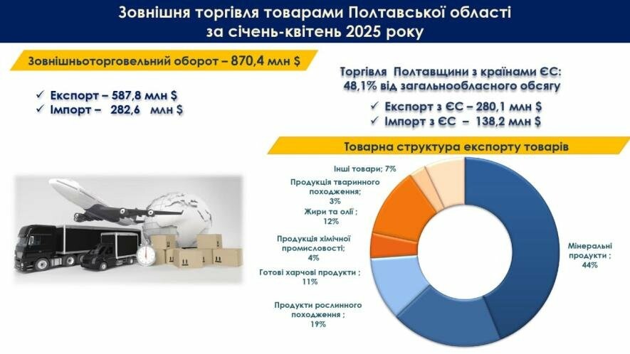 Зовнішня торгівля Полтавщини перевищила 870 мільйонів доларів за чотири місяці