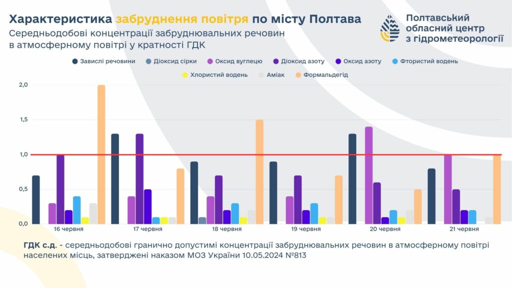 Протягом тижня з 16 по 21 червня повітря в Полтаві мало підвищені рівні забруднення, що викликає занепокоєння серед фахівців та екологів. Як повідомляє новинний портал Полтави з посиланням на обласний центр з гідрометеорології, під час щоденного моніторингу повітря у місті зафіксували перевищення допустимих концентрацій одразу чотирьох небезпечних речовин.