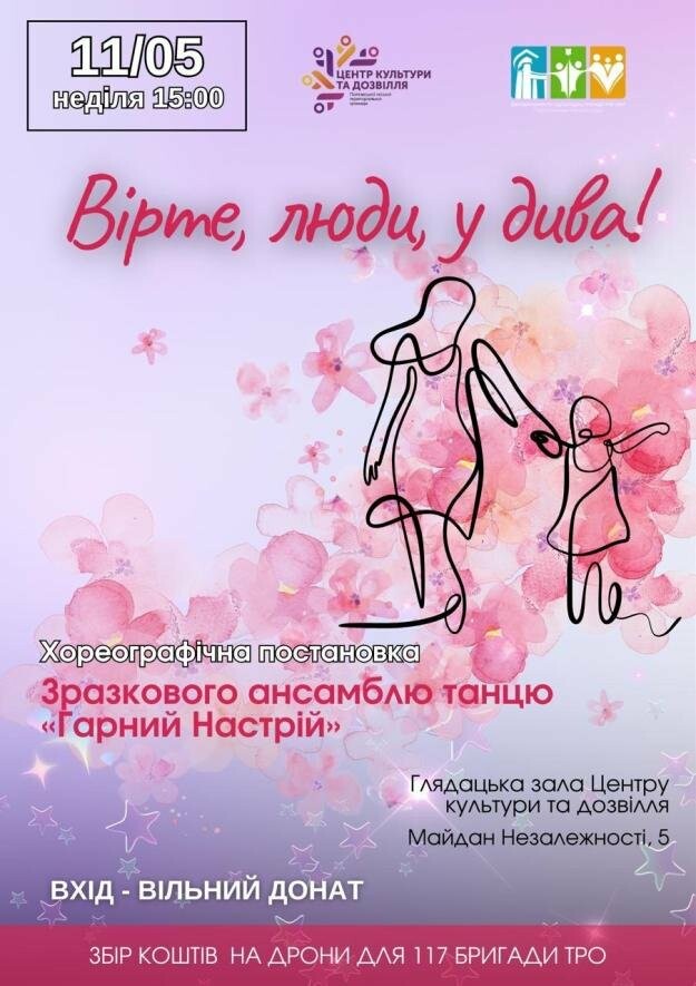 У Полтаві до Дня матері відбудеться хореографічна вистава, присвячена темам любові та віри в чудеса. 11 травня о 15:00 Центр культури та дозвілля запрошує всіх охочих на благодійну постановку «Вірте, люди, у дива!», яка вже вдруге буде представлена на сцені Зразковим ансамблем танцю «Гарний настрій».