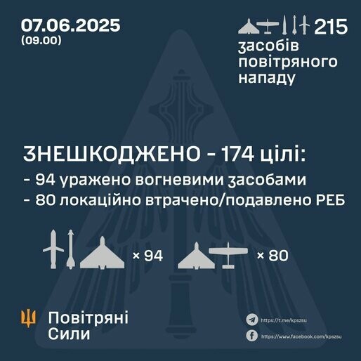 Повітряні сили Збройних сил України повідомили, що у ніч на 7 червня ворог здійснив атаку, використавши 215 засобів повітряного нападу:
