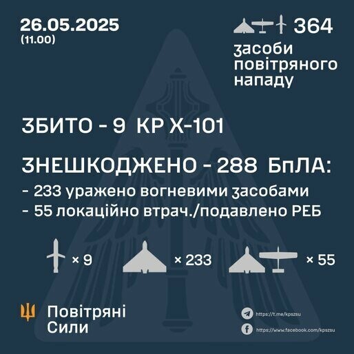 За попередніми даними станом на 11:00 протиповітряною обороною було збито всі 9 крилатих ракет Х-101, а також знешкоджено 288 ворожих БпЛА типу Shahed та інших безпілотників на сході, півночі, півдні, заході та в центрі країни.